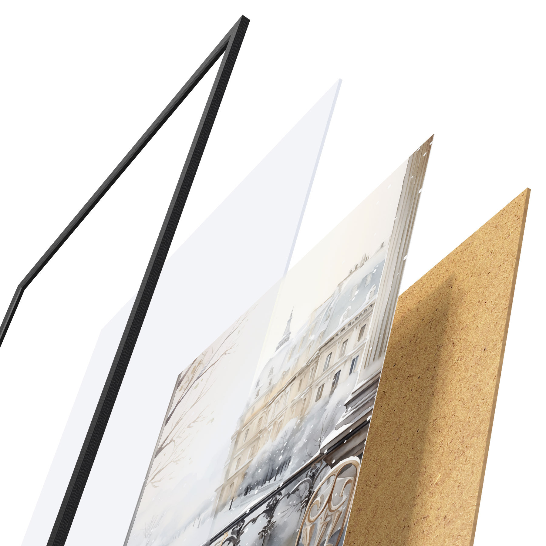 El póster consta de marco, plexiglás, imagen impresa y soporte de aglomerado. El póster puede colgarse inmediatamente en la pared gracias a los soportes de la parte posterior.