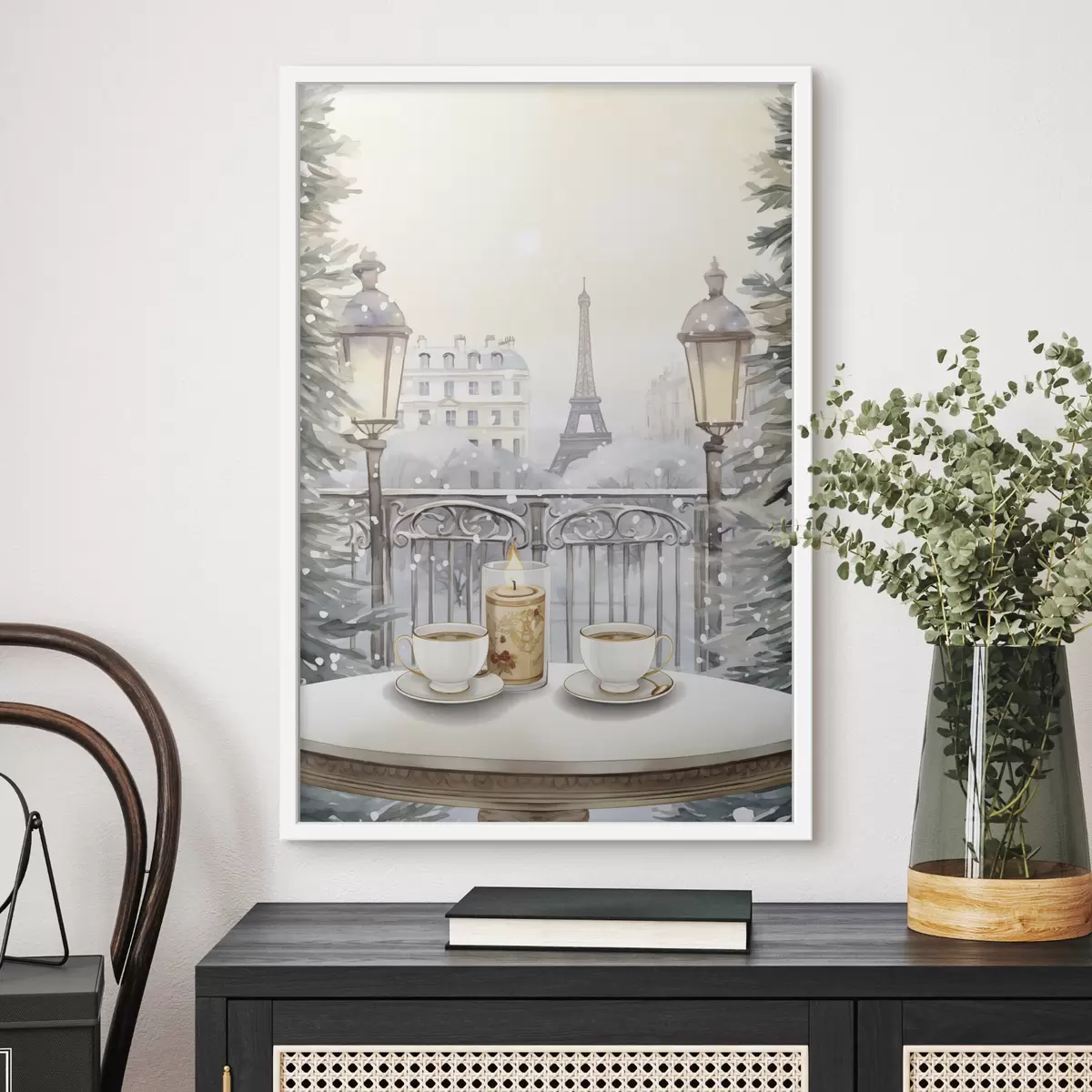 Poster Hermoso café en París, tazas de té, vista romántica, invierno, estilo acuarela f42799