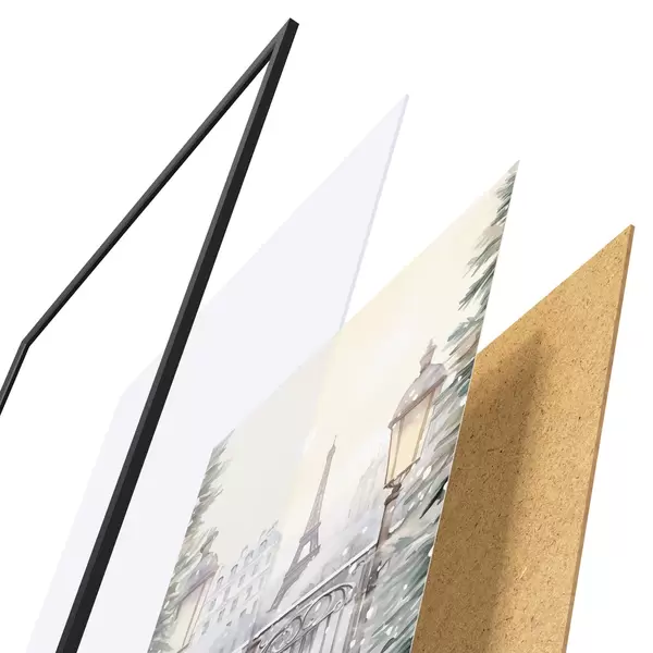 El póster consta de marco, plexiglás, imagen impresa y soporte de aglomerado. El póster puede colgarse inmediatamente en la pared gracias a los soportes de la parte posterior.