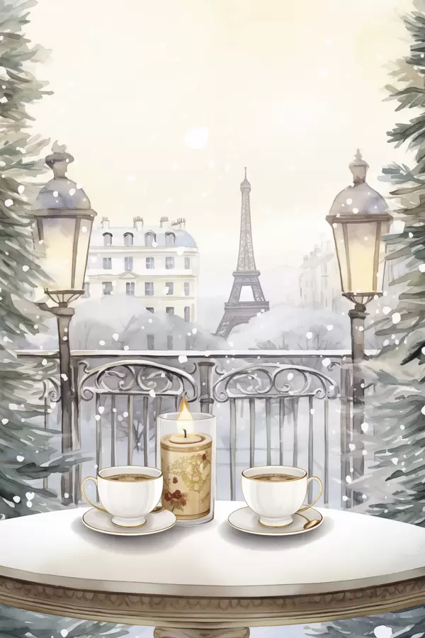 Poster Hermoso café en París, tazas de té, vista romántica, invierno, estilo acuarela f42799