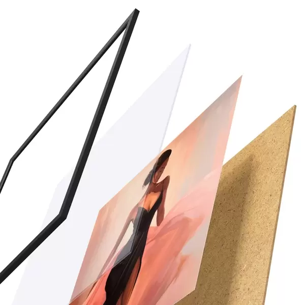 El póster consta de marco, plexiglás, imagen impresa y soporte de aglomerado. El póster puede colgarse inmediatamente en la pared gracias a los soportes de la parte posterior.