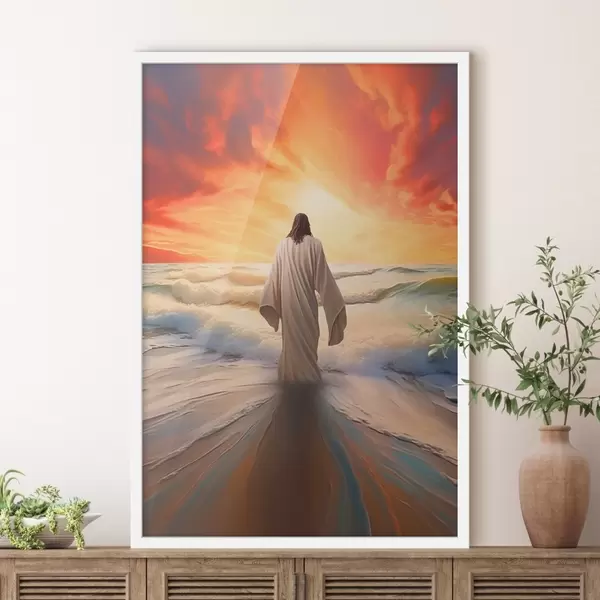 Poster Hombre junto al agua sobre el fondo de la puesta de sol Nr f42824