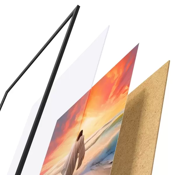 El póster consta de marco, plexiglás, imagen impresa y soporte de aglomerado. El póster puede colgarse inmediatamente en la pared gracias a los soportes de la parte posterior.