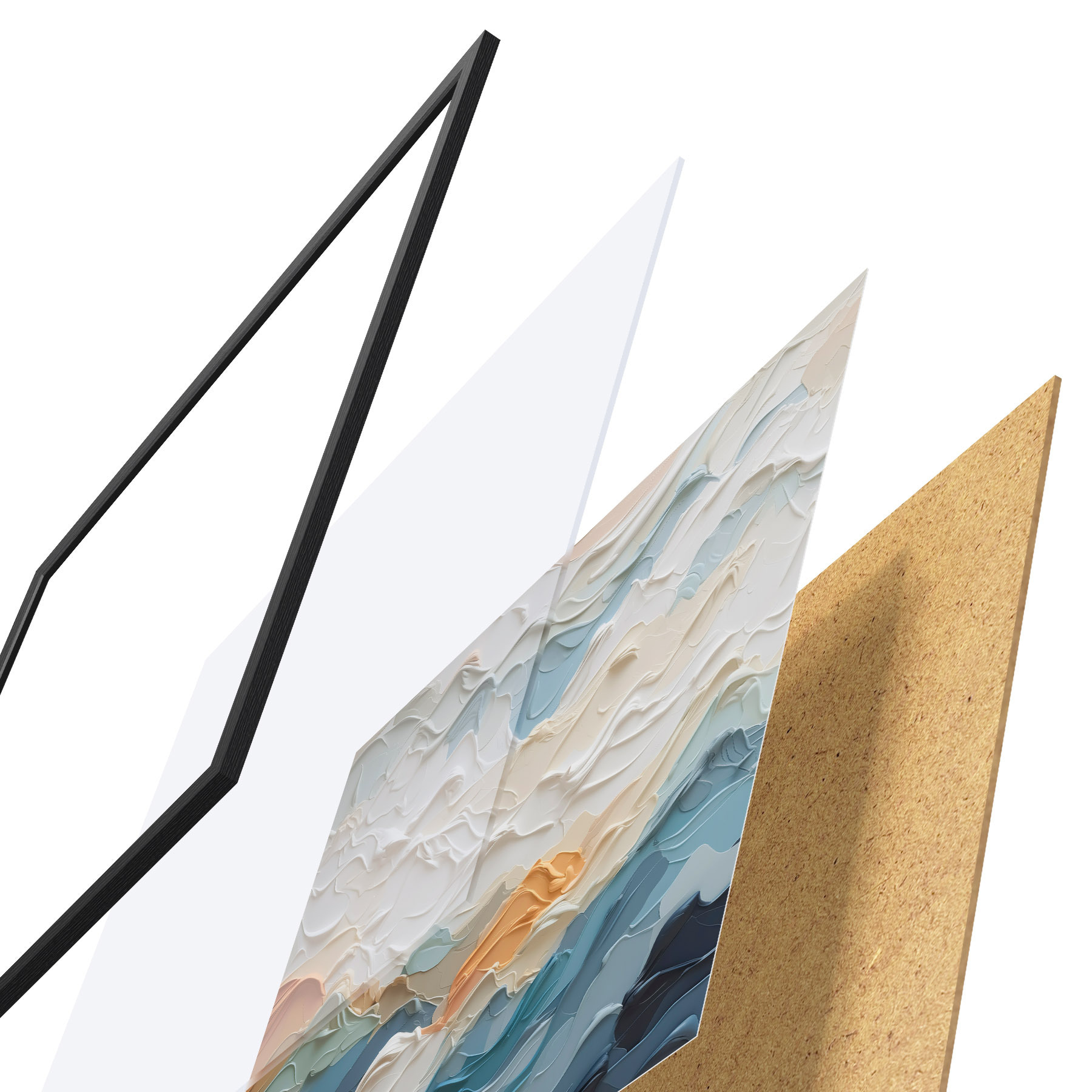 El póster consta de marco, plexiglás, imagen impresa y soporte de aglomerado. El póster puede colgarse inmediatamente en la pared gracias a los soportes de la parte posterior.