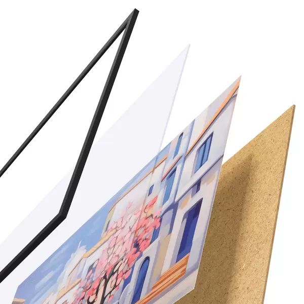 El póster consta de marco, plexiglás, imagen impresa y soporte de aglomerado. El póster puede colgarse inmediatamente en la pared gracias a los soportes de la parte posterior.