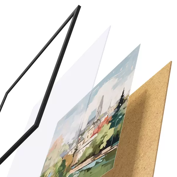 El póster consta de marco, plexiglás, imagen impresa y soporte de aglomerado. El póster puede colgarse inmediatamente en la pared gracias a los soportes de la parte posterior.