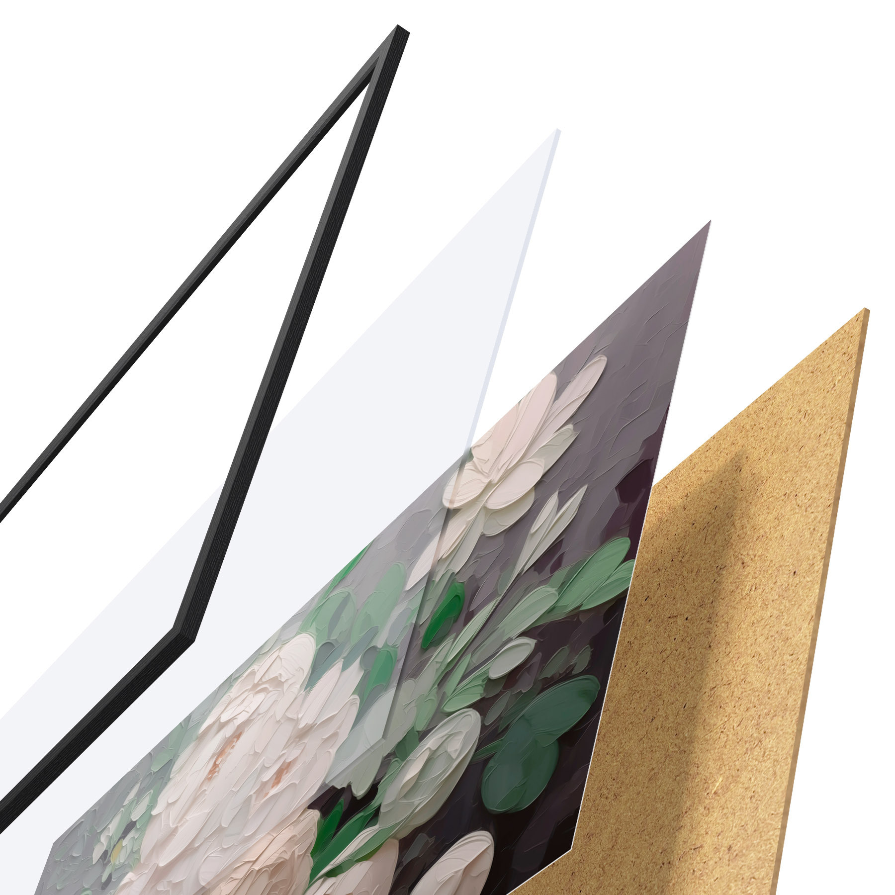 El póster consta de marco, plexiglás, imagen impresa y soporte de aglomerado. El póster puede colgarse inmediatamente en la pared gracias a los soportes de la parte posterior.