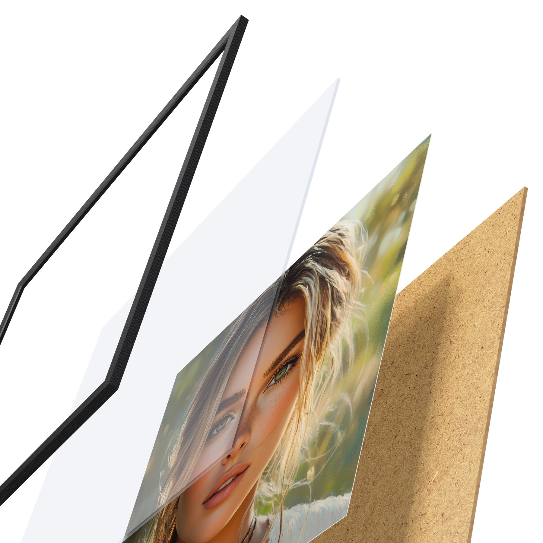 El póster consta de marco, plexiglás, imagen impresa y soporte de aglomerado. El póster puede colgarse inmediatamente en la pared gracias a los soportes de la parte posterior.