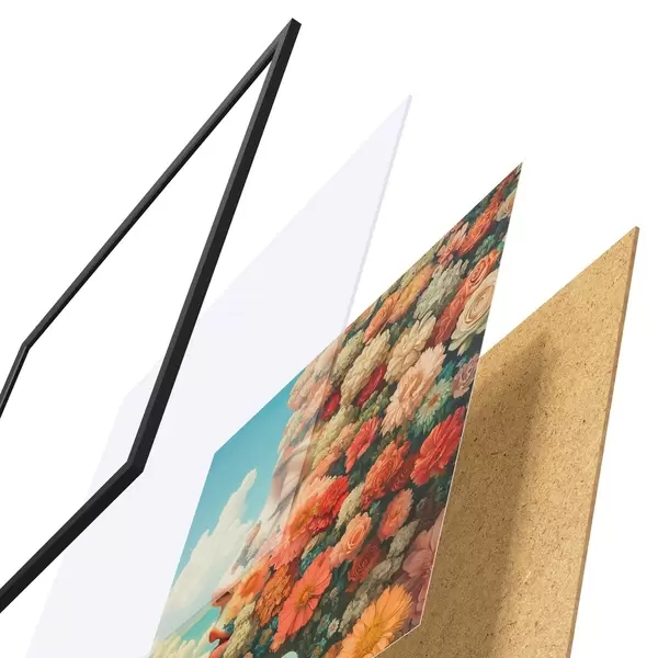 El póster consta de marco, plexiglás, imagen impresa y soporte de aglomerado. El póster puede colgarse inmediatamente en la pared gracias a los soportes de la parte posterior.