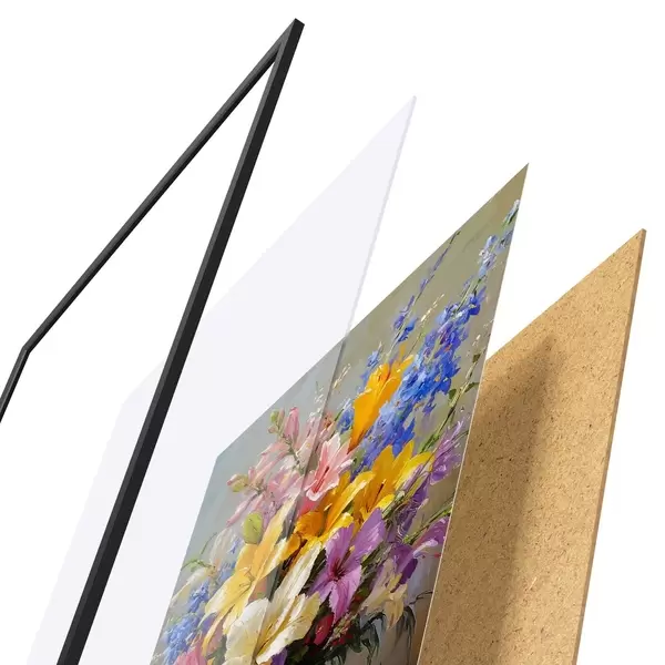 El póster consta de marco, plexiglás, imagen impresa y soporte de aglomerado. El póster puede colgarse inmediatamente en la pared gracias a los soportes de la parte posterior.