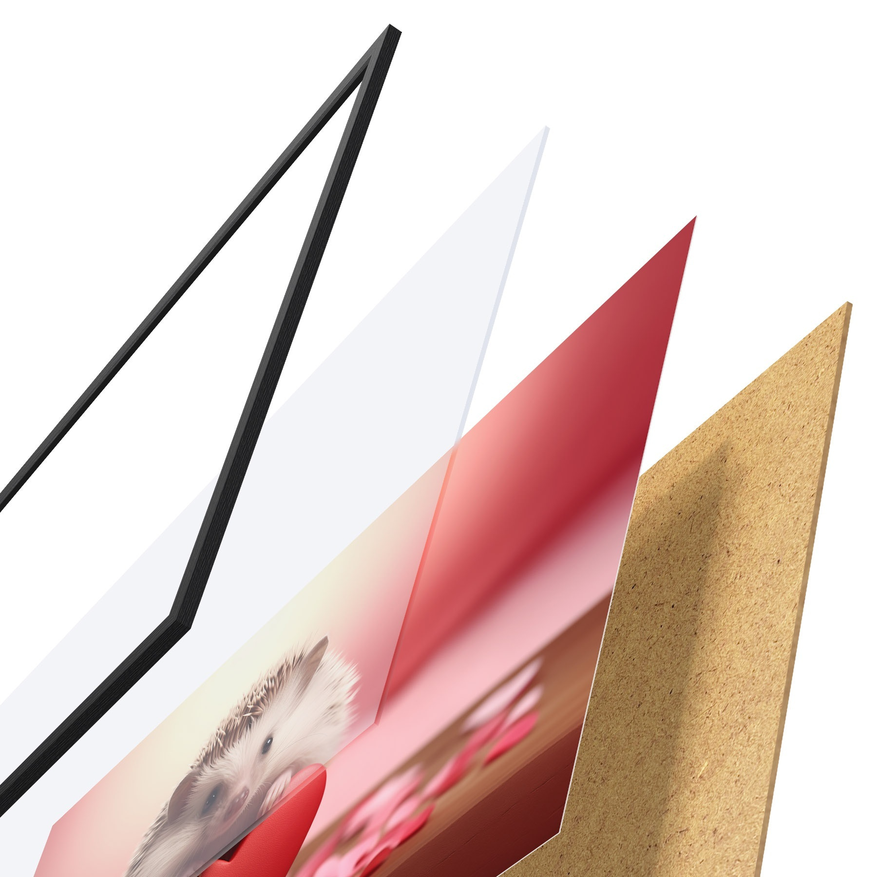 El póster consta de marco, plexiglás, imagen impresa y soporte de aglomerado. El póster puede colgarse inmediatamente en la pared gracias a los soportes de la parte posterior.