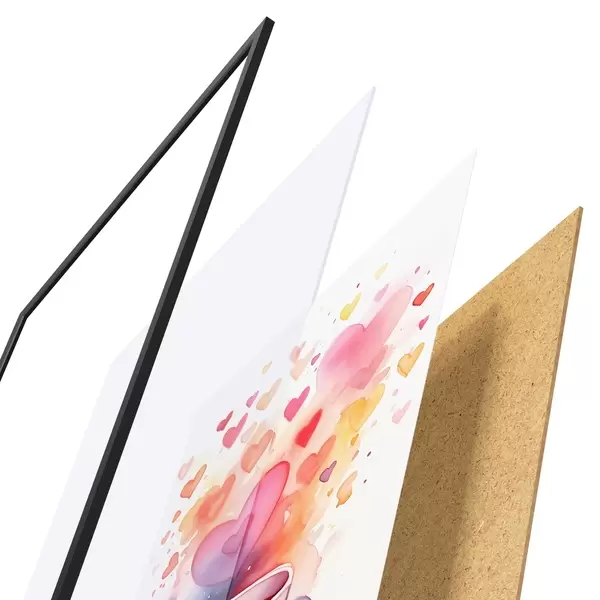 El póster consta de marco, plexiglás, imagen impresa y soporte de aglomerado. El póster puede colgarse inmediatamente en la pared gracias a los soportes de la parte posterior.