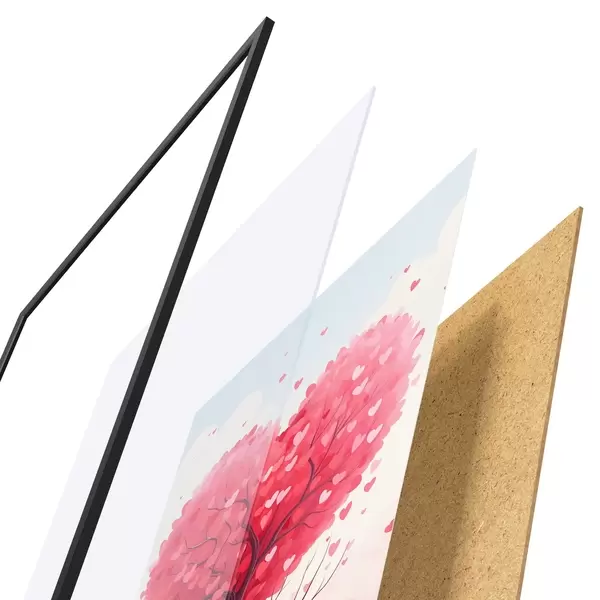 El póster consta de marco, plexiglás, imagen impresa y soporte de aglomerado. El póster puede colgarse inmediatamente en la pared gracias a los soportes de la parte posterior.