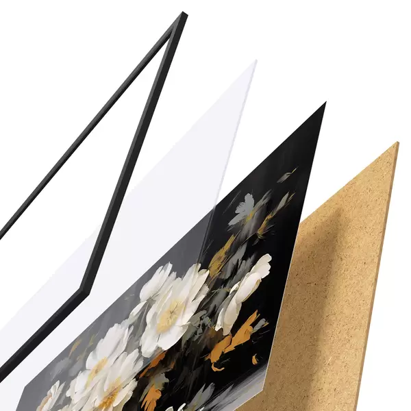 El póster consta de marco, plexiglás, imagen impresa y soporte de aglomerado. El póster puede colgarse inmediatamente en la pared gracias a los soportes de la parte posterior.