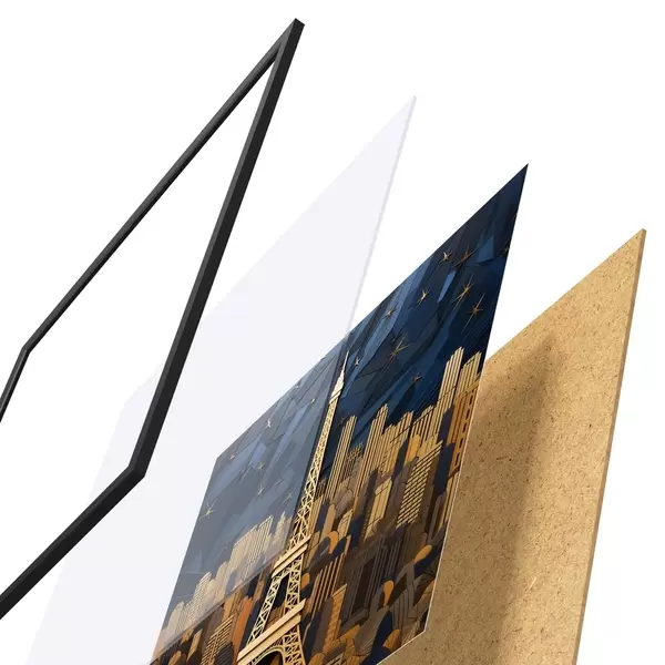El póster consta de marco, plexiglás, imagen impresa y soporte de aglomerado. El póster puede colgarse inmediatamente en la pared gracias a los soportes de la parte posterior.