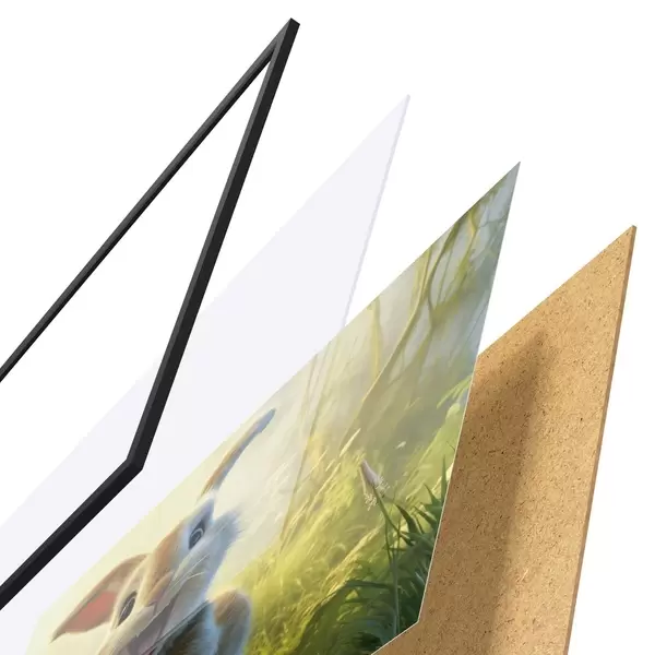 El póster consta de marco, plexiglás, imagen impresa y soporte de aglomerado. El póster puede colgarse inmediatamente en la pared gracias a los soportes de la parte posterior.