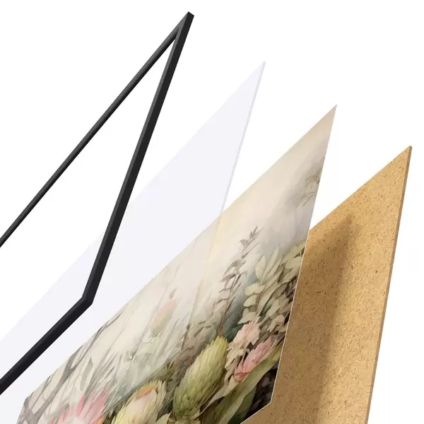 El póster consta de marco, plexiglás, imagen impresa y soporte de aglomerado. El póster puede colgarse inmediatamente en la pared gracias a los soportes de la parte posterior.