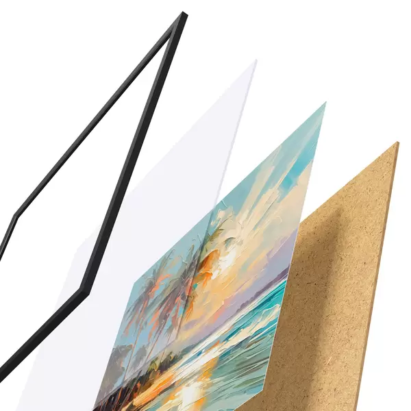 El póster consta de marco, plexiglás, imagen impresa y soporte de aglomerado. El póster puede colgarse inmediatamente en la pared gracias a los soportes de la parte posterior.