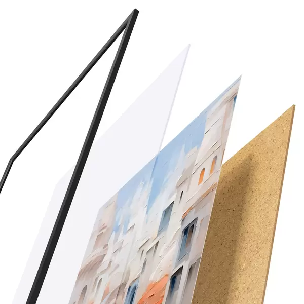El póster consta de marco, plexiglás, imagen impresa y soporte de aglomerado. El póster puede colgarse inmediatamente en la pared gracias a los soportes de la parte posterior.