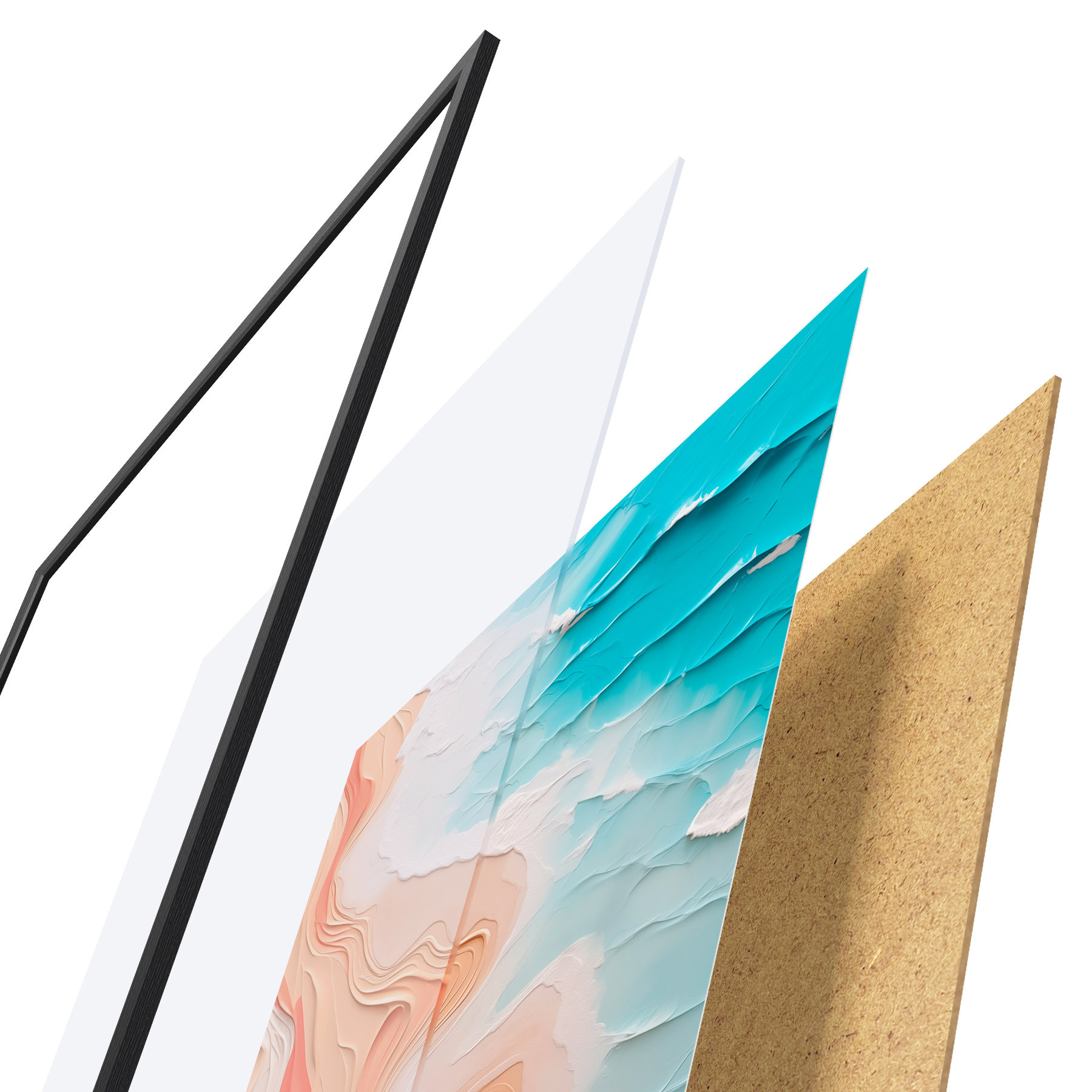 El póster consta de marco, plexiglás, imagen impresa y soporte de aglomerado. El póster puede colgarse inmediatamente en la pared gracias a los soportes de la parte posterior.