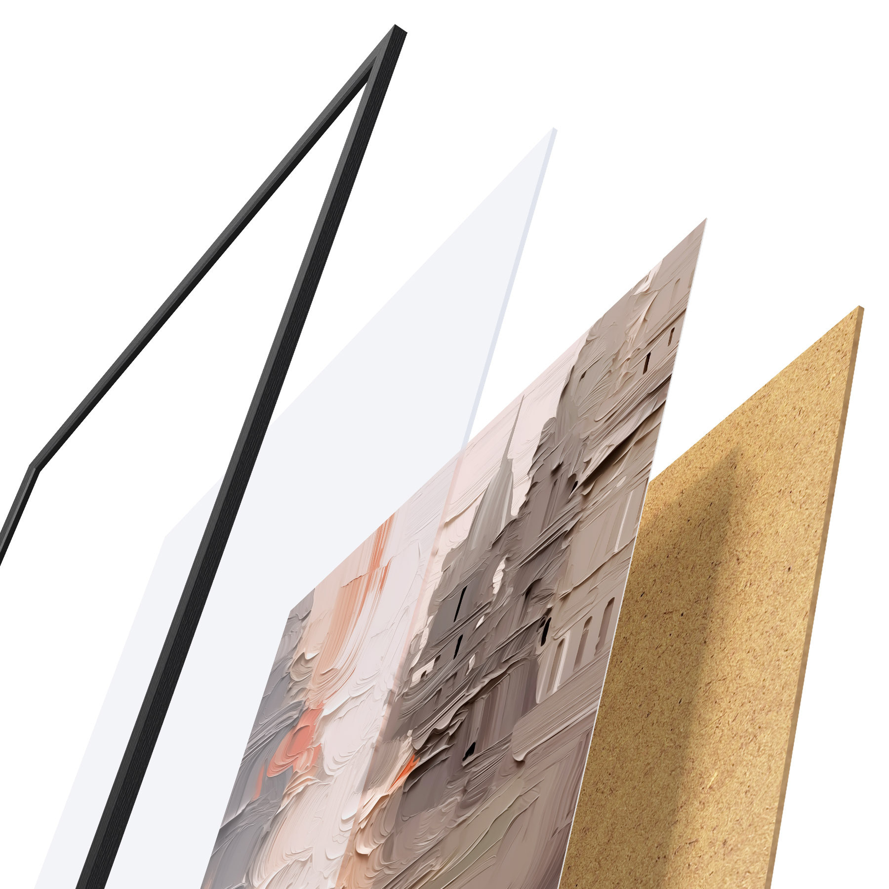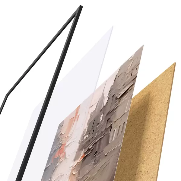 El póster consta de marco, plexiglás, imagen impresa y soporte de aglomerado. El póster puede colgarse inmediatamente en la pared gracias a los soportes de la parte posterior.