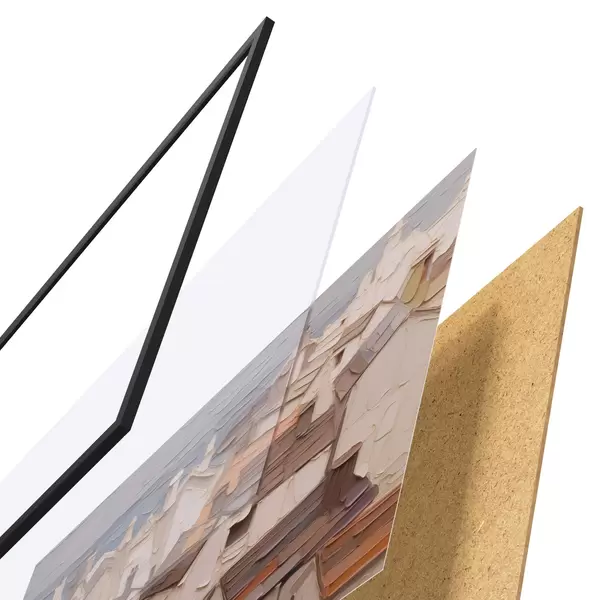 El póster consta de marco, plexiglás, imagen impresa y soporte de aglomerado. El póster puede colgarse inmediatamente en la pared gracias a los soportes de la parte posterior.