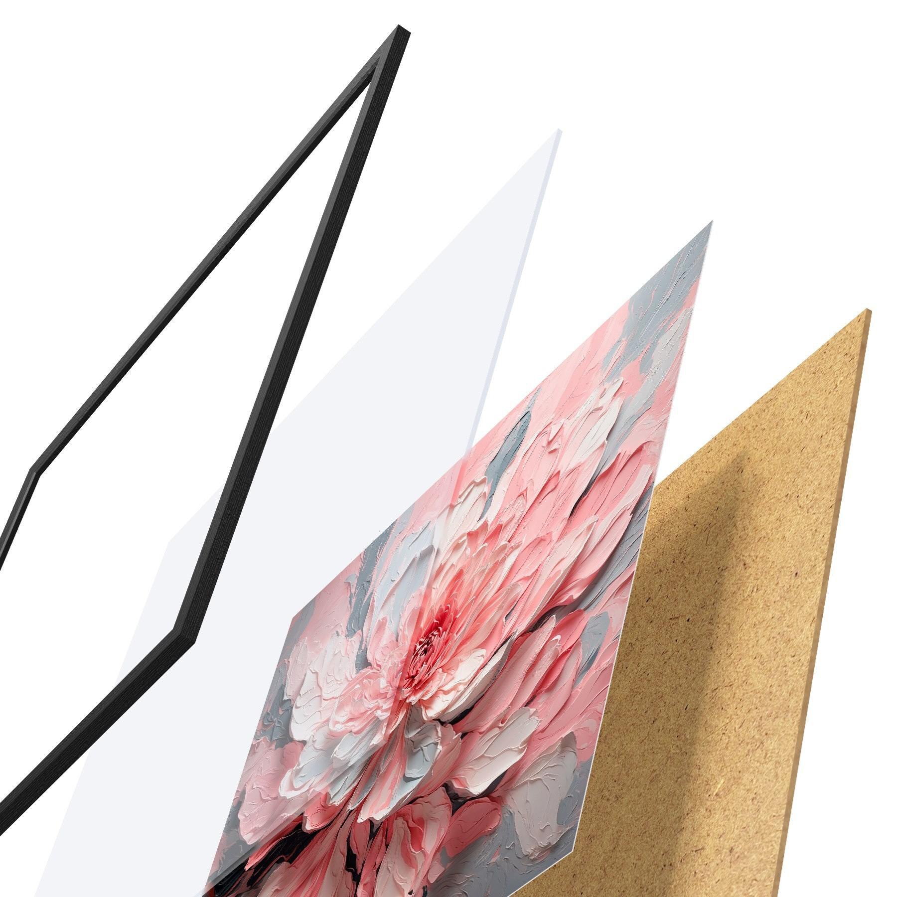 El póster consta de marco, plexiglás, imagen impresa y soporte de aglomerado. El póster puede colgarse inmediatamente en la pared gracias a los soportes de la parte posterior.
