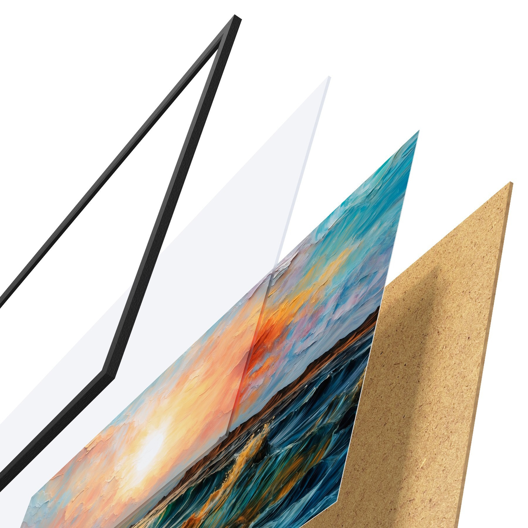 El póster consta de marco, plexiglás, imagen impresa y soporte de aglomerado. El póster puede colgarse inmediatamente en la pared gracias a los soportes de la parte posterior.