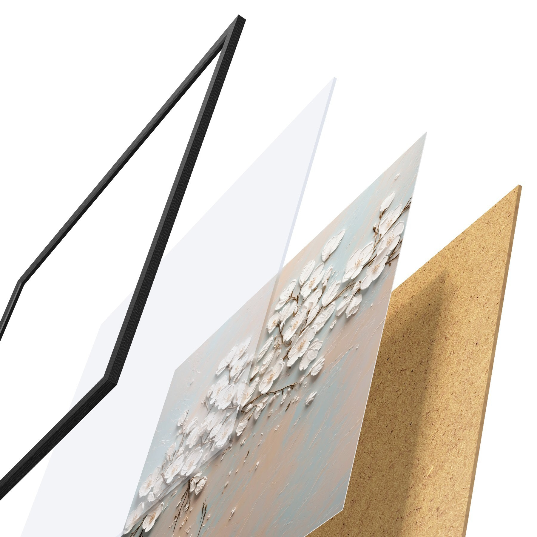 El póster consta de marco, plexiglás, imagen impresa y soporte de aglomerado. El póster puede colgarse inmediatamente en la pared gracias a los soportes de la parte posterior.