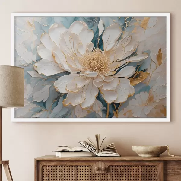 Poster Flujo blanco con contorno dorado sobre fondo azul y blanco f42923