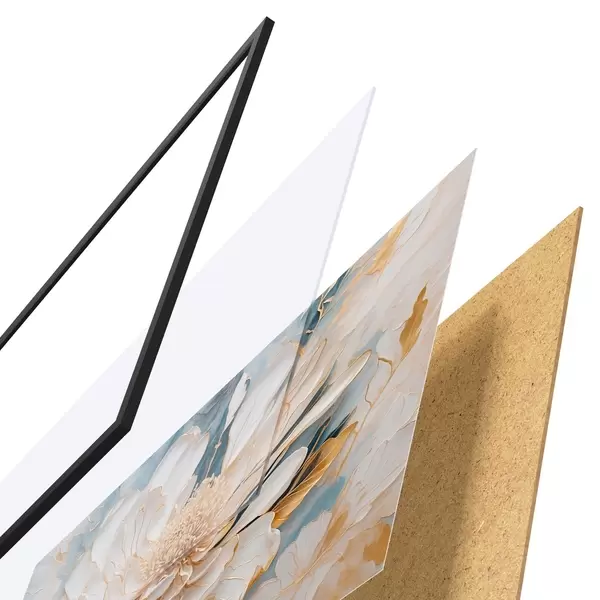 El póster consta de marco, plexiglás, imagen impresa y soporte de aglomerado. El póster puede colgarse inmediatamente en la pared gracias a los soportes de la parte posterior.