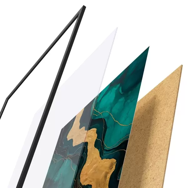El póster consta de marco, plexiglás, imagen impresa y soporte de aglomerado. El póster puede colgarse inmediatamente en la pared gracias a los soportes de la parte posterior.