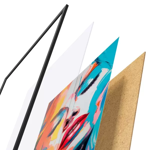 El póster consta de marco, plexiglás, imagen impresa y soporte de aglomerado. El póster puede colgarse inmediatamente en la pared gracias a los soportes de la parte posterior.