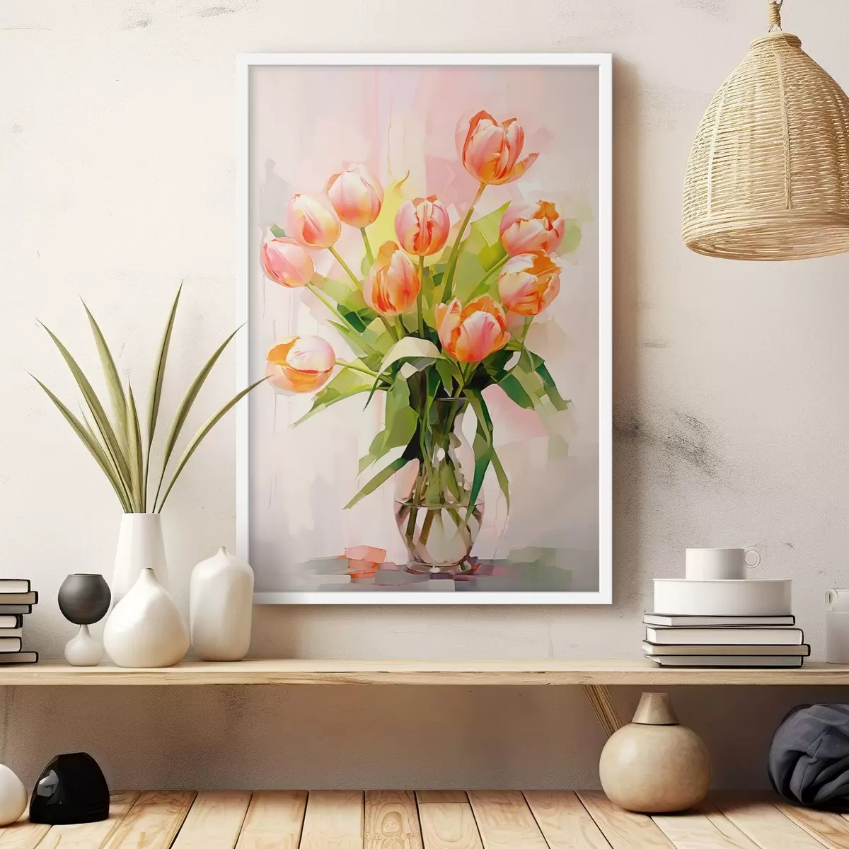 Poster Bodegón pictórico con tulipanes en un jarrón de cristal sobre fondo claro f42940