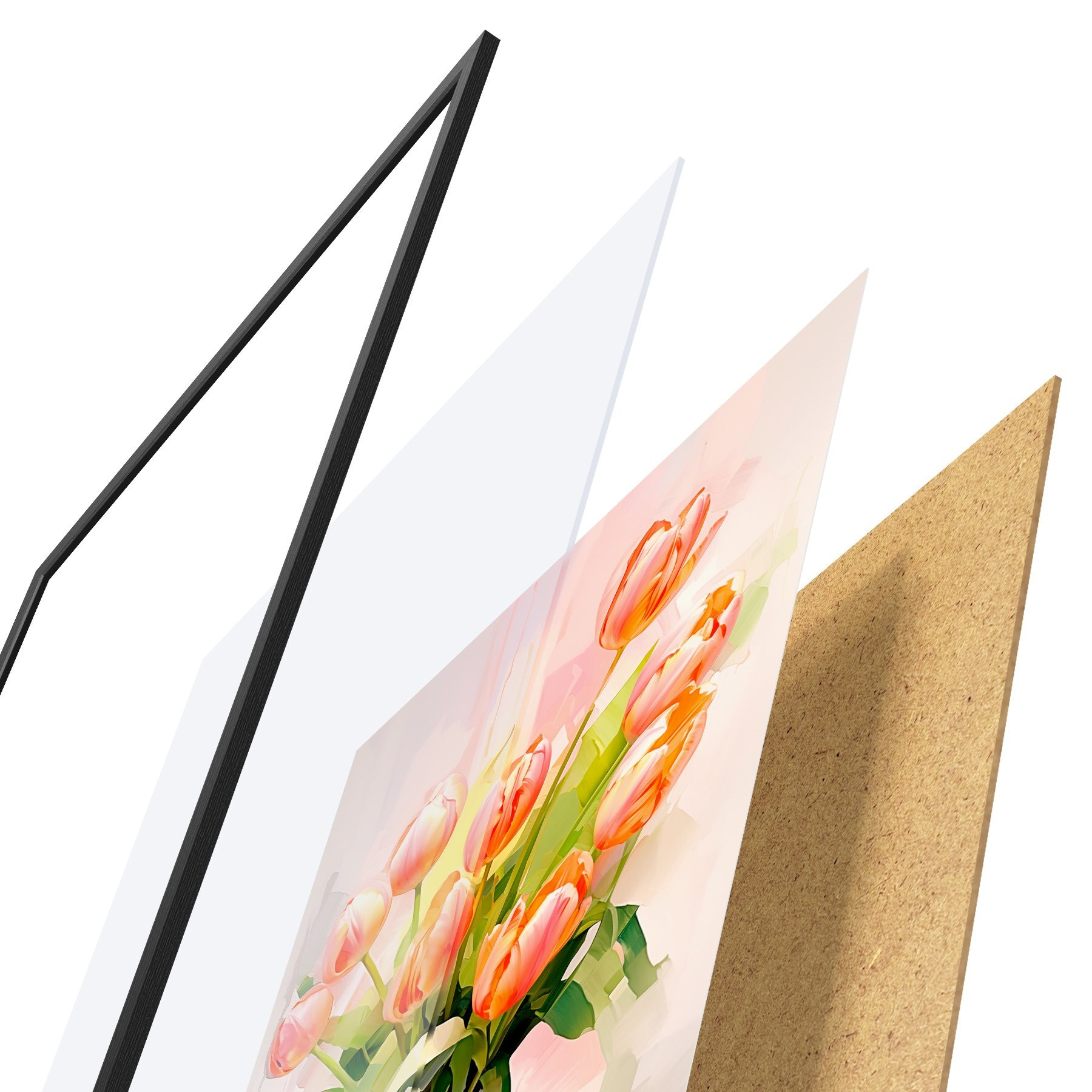 El póster consta de marco, plexiglás, imagen impresa y soporte de aglomerado. El póster puede colgarse inmediatamente en la pared gracias a los soportes de la parte posterior.