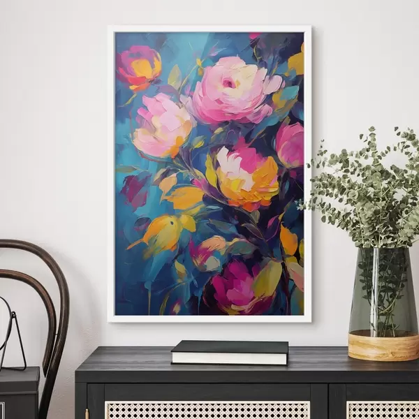 Poster Cuadro abstracto con flores vibrantes sobre fondo azul f42941