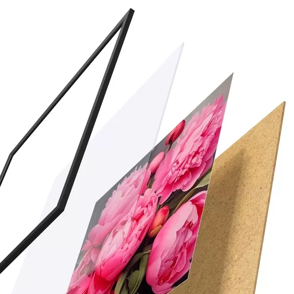El póster consta de marco, plexiglás, imagen impresa y soporte de aglomerado. El póster puede colgarse inmediatamente en la pared gracias a los soportes de la parte posterior.