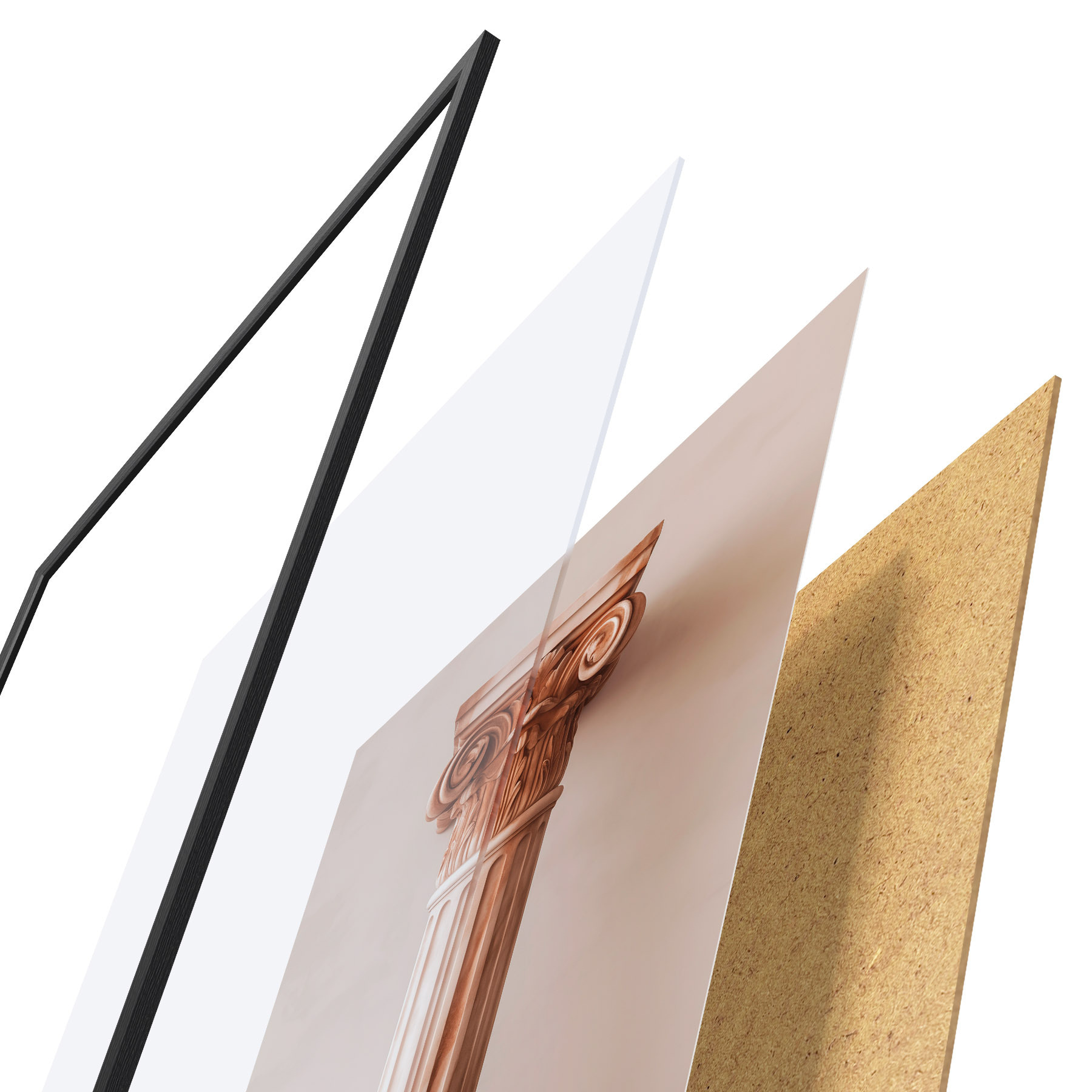 El póster consta de marco, plexiglás, imagen impresa y soporte de aglomerado. El póster puede colgarse inmediatamente en la pared gracias a los soportes de la parte posterior.