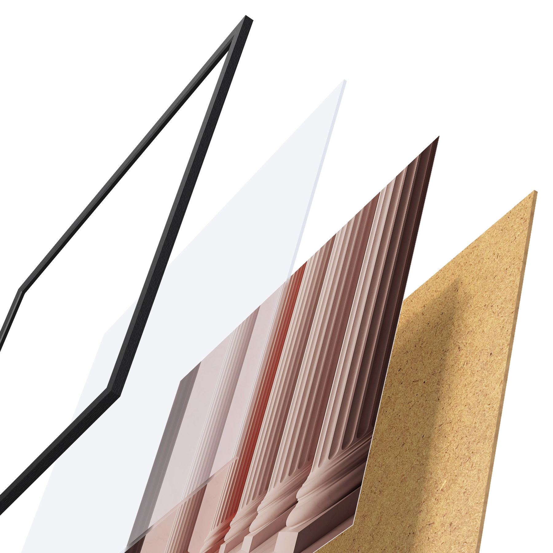 El póster consta de marco, plexiglás, imagen impresa y soporte de aglomerado. El póster puede colgarse inmediatamente en la pared gracias a los soportes de la parte posterior.