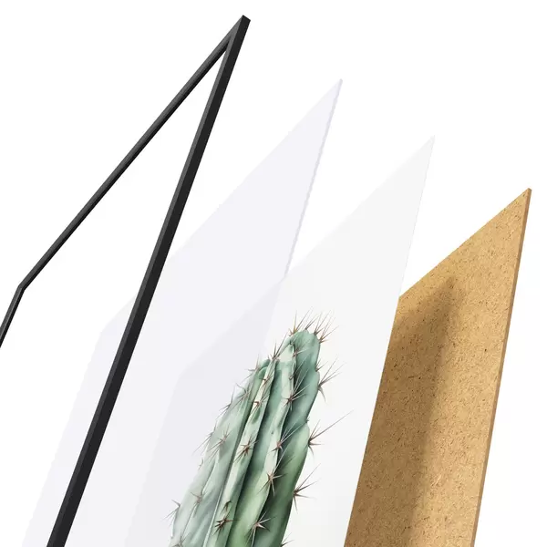 El póster consta de marco, plexiglás, imagen impresa y soporte de aglomerado. El póster puede colgarse inmediatamente en la pared gracias a los soportes de la parte posterior.