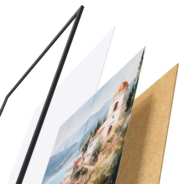 El póster consta de marco, plexiglás, imagen impresa y soporte de aglomerado. El póster puede colgarse inmediatamente en la pared gracias a los soportes de la parte posterior.