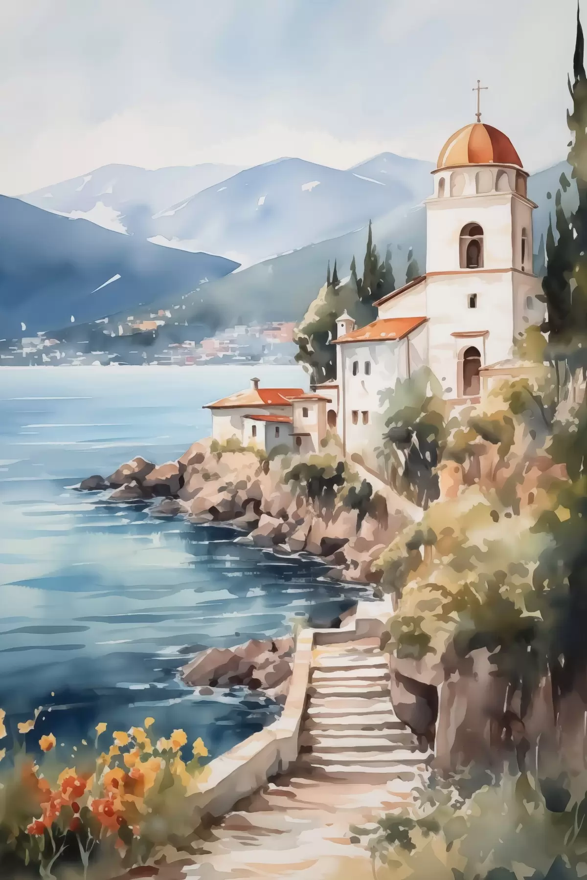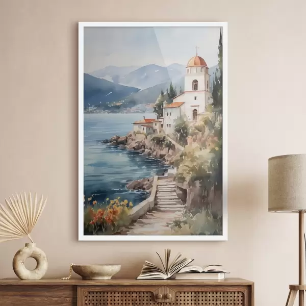 Poster Iglesia junto al mar con montañas al fondo Nr f42962
