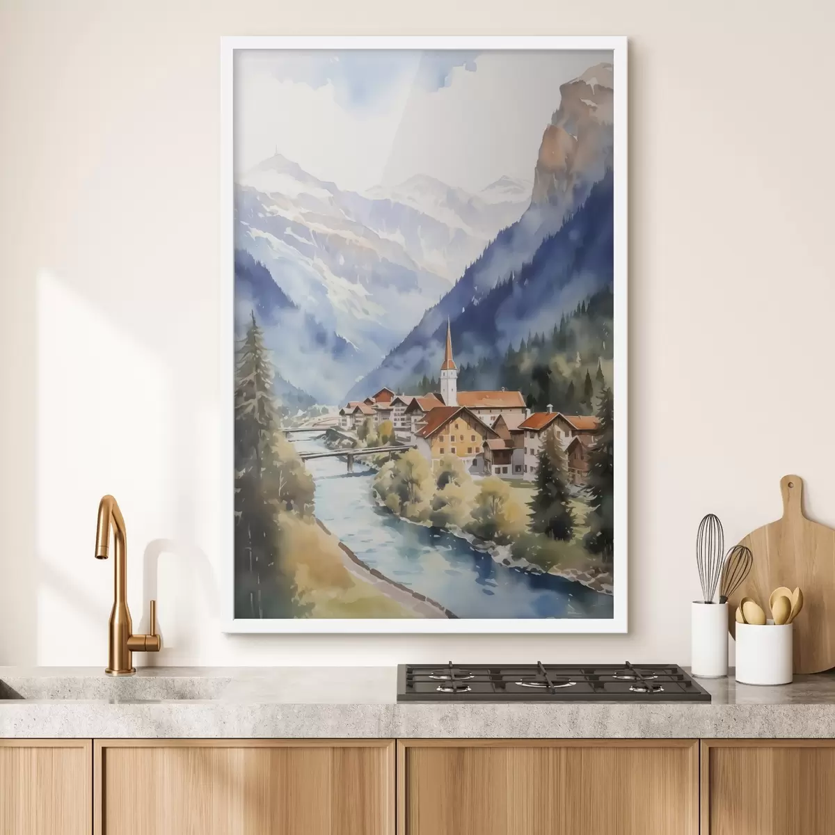 Poster Pueblo cerca de las montañas imitación acuarela f42964