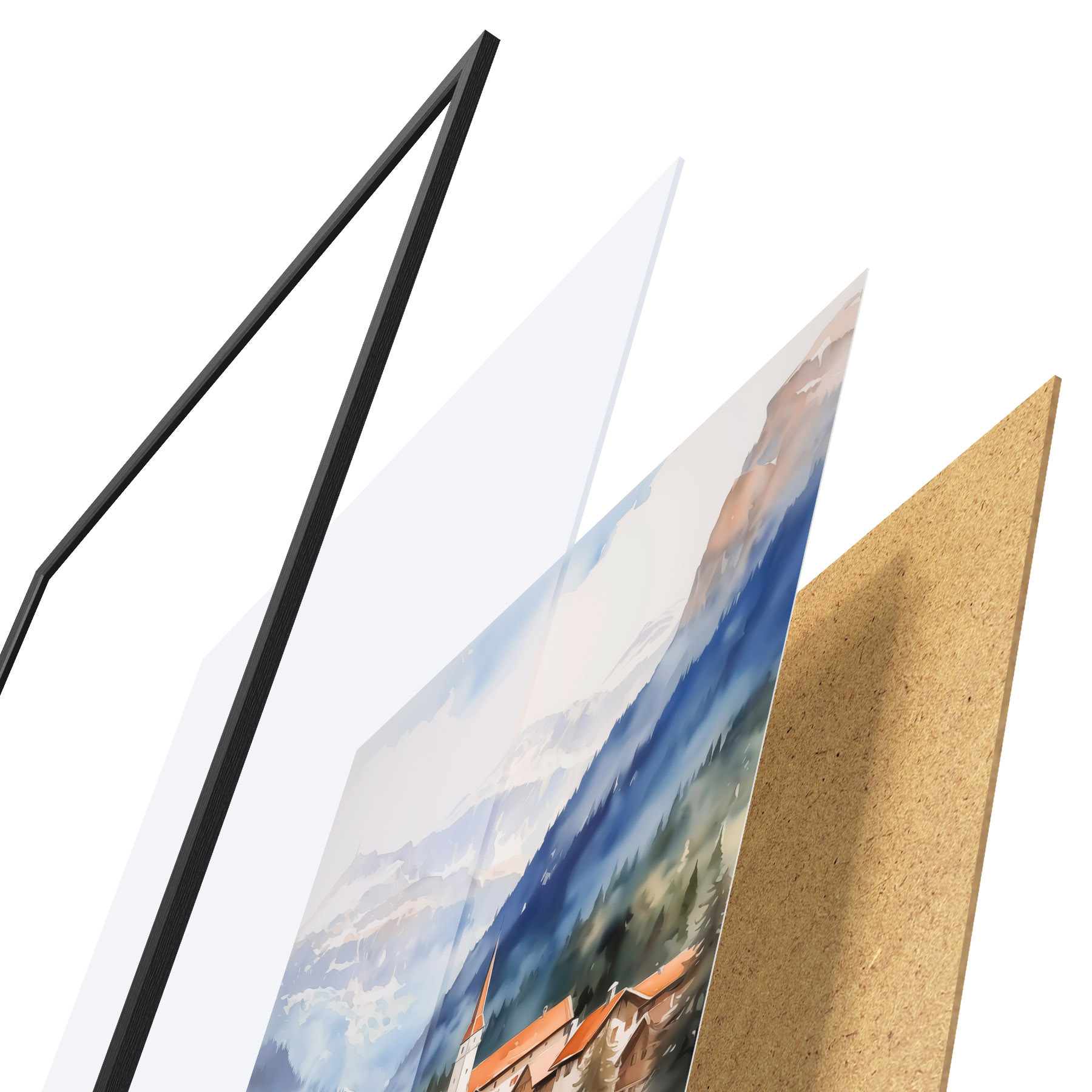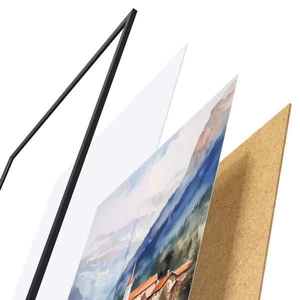 El póster consta de marco, plexiglás, imagen impresa y soporte de aglomerado. El póster puede colgarse inmediatamente en la pared gracias a los soportes de la parte posterior.
