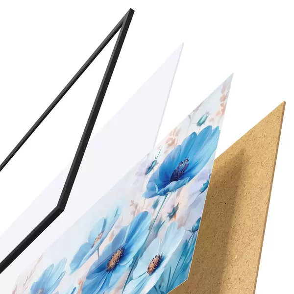El póster consta de marco, plexiglás, imagen impresa y soporte de aglomerado. El póster puede colgarse inmediatamente en la pared gracias a los soportes de la parte posterior.
