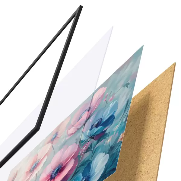El póster consta de marco, plexiglás, imagen impresa y soporte de aglomerado. El póster puede colgarse inmediatamente en la pared gracias a los soportes de la parte posterior.