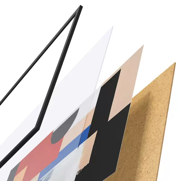 El póster consta de marco, plexiglás, imagen impresa y soporte de aglomerado. El póster puede colgarse inmediatamente en la pared gracias a los soportes de la parte posterior.
