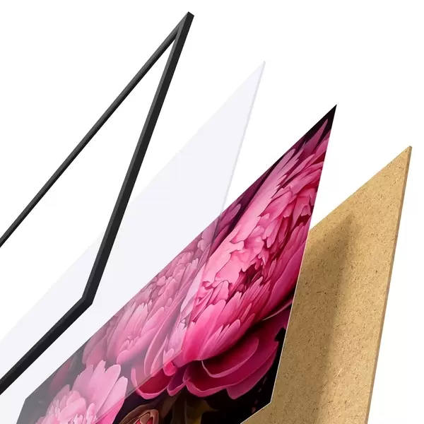 El póster consta de marco, plexiglás, imagen impresa y soporte de aglomerado. El póster puede colgarse inmediatamente en la pared gracias a los soportes de la parte posterior.
