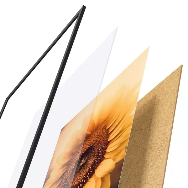 El póster consta de marco, plexiglás, imagen impresa y soporte de aglomerado. El póster puede colgarse inmediatamente en la pared gracias a los soportes de la parte posterior.