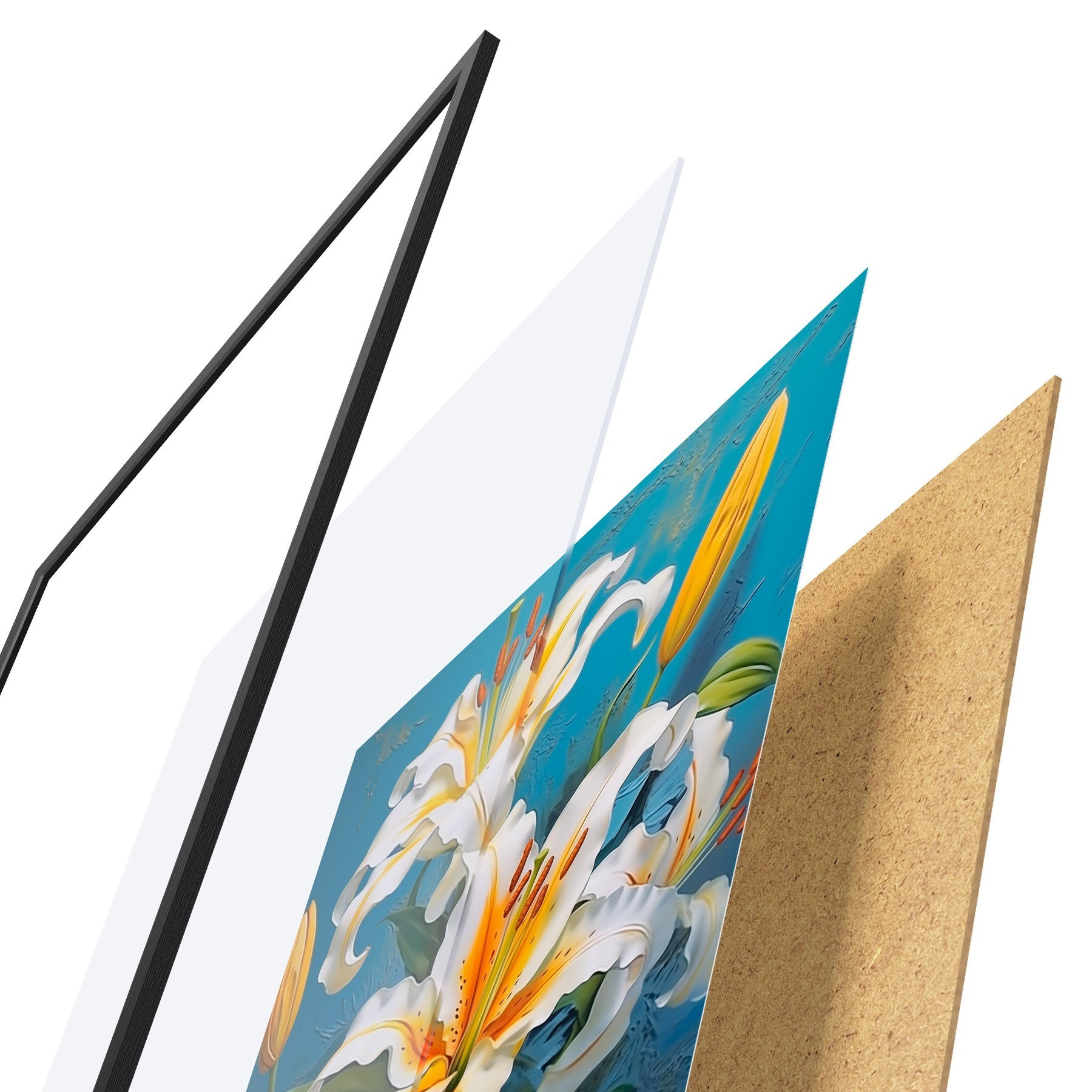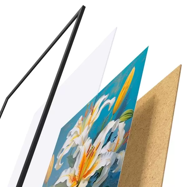 El póster consta de marco, plexiglás, imagen impresa y soporte de aglomerado. El póster puede colgarse inmediatamente en la pared gracias a los soportes de la parte posterior.